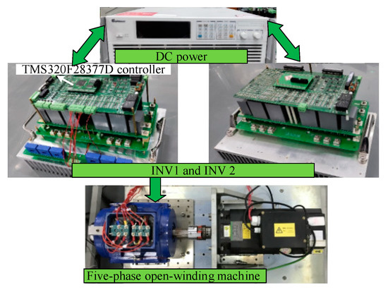 In this part, experiments are implemented on an open-winding five-phase machine system whose photograph is shown in Figure 13. INV 1 and INV 2 both have six bridge legs and ten of them are employed here, which are controlled by one same Digital Signal Processor (DSP TMS320F28377). Parameters of the induction machine and the experiments setting are listed in Table 2. It should be noted that due to the limited testbed, the CMV, winding currents and EMI characteristics are tested and compared in this part; however, the shaft voltage and bearing current issues are not examined.