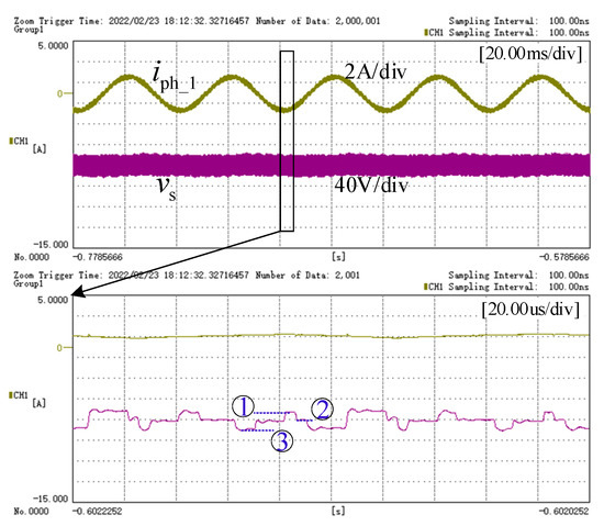 The shell voltage under the CSPWM 3 is shown in Figure 15. Clearly, varies between three levels with the amplitude of 16 V and step 11 times in a switching period, which declines 80% and about 50% corresponding the analysis in Section 2.3. Additionally, there appears no dead-time ripple in .