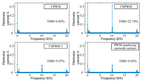 As shown in Figure 14 and Figure 15, the current deteriorates obviously under the CRPWM, and the level of current ripples under the traditional PWM and CSPWM 3 are closed. The current fast Fourier transform (FFT) results under the above three PWM methods are shown in Figure 16. Additionally, the current FFT result under the PWM method in which unchanged sawtooth carriers employed is also shown in Figure 16, to show the carrier switching effects on the current quality.