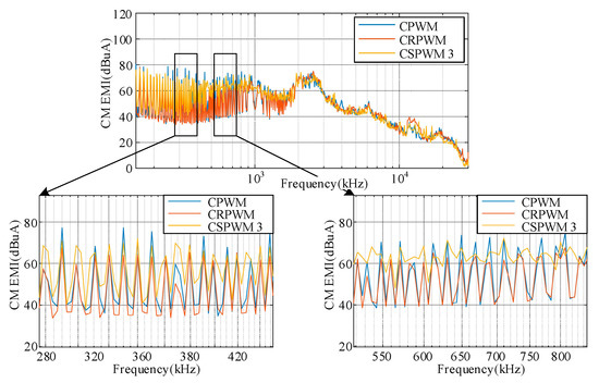 Table 3 shows the comparison of CM EMI peaks in different frequency bands. In the frequency bands of 200 kHz–300 kHz, 300 kHz–500 kHz and 500 kHz–1 MHz, compared with the traditional CPWM, the CM EMI peaks under the CSWPM decreases by 5.27 , 5.24 and 2.14 respectively, and that under the CRPWM decreases by 7.74 , 11.89 and 7.00 . In the frequency band beyond 10 MHz, differences of CM EMI under different PWM methods are not obvious.
