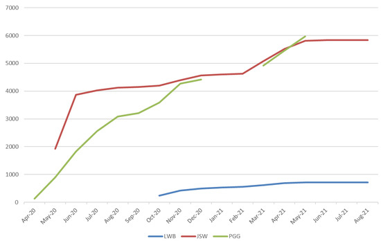 The epidemiological crisis in the coal mining sector began in March 2020. At that time, the first Crisis Staff in mining companies started to be established. The first cases of coronavirus infection in mines in Poland emerged in April. In Polska Grupa Górnicza SA (PGG SA), the first case was reported on 16 April 2020 at the Jankowice mine in Rybnik. The situation was similar at Jastrzębska Spółka Węglowa SA (JSW SA), where the first case of infection occurred on 26 April 2020 at the Pniówek mine. In contrast, the first cases at LW Bogdanka S.A. were not reported until 7 October 2020 (Figure 1).