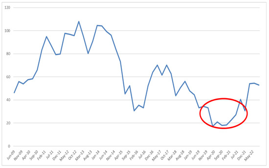 Due to this fact, the demand for coal in this period also decreased—which directly affected the financial results of mining companies. Taking the example of LW Bogdanka S.A., the financial result in 2020 was more than 76% lower than in 2019. The reduction in the level of the financial result directly affected the deterioration of a number of financial indicators (e.g., such as ROA and ROE). This situation was also reflected in the market value of LW Bogdanka S.A.—which is mainly represented by the company’s share prices—Figure 11 shows LWB’s share prices as the company’s appearance on the Warsaw Stock Exchange.