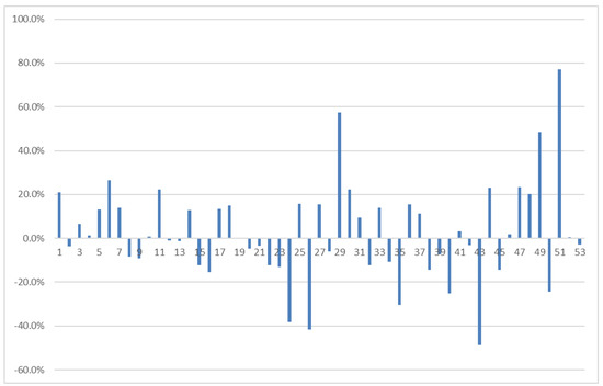 As the figure shows, share prices have been declining since 2017—nevertheless, 2020 saw the lowest share value since their issue (price per share of PLN 14.17). When considering the dynamics of LWB’s share price changes, it should also be noted that the first quarter of 2020 saw the strongest share price decrease since the share issue, i.e., by 48.6% quarter-on-quarter, as shown in Figure 12.