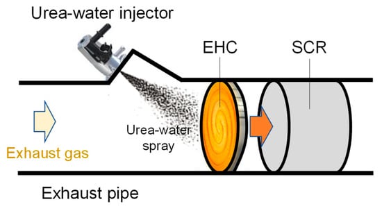 The EHC has been introduced as a measure to increase the operating temperatures of three-way catalysts (TWCs) in gasoline engines during the cold start [11,12,13]. It has also been applied to diesel oxidation catalysts (DOC) and urea-SCR systems to enhance the evaporation and decomposition performance of the urea–water solution, particularly in cold start conditions by increasing the exhaust gas temperature [14,15,16,17]. The evaporation and decomposition performance can be further enhanced by injecting the urea–water solution directly into the heater in the EHC so that the thermal energy of the heater can be used.