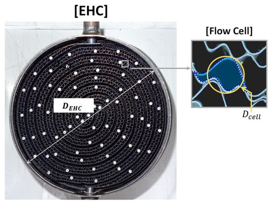 The picture of EHC applied in this study is presented in Figure 2. Two types of heater foils having different curvature radii are applied so that the foils can be laminated with the formation of tiny flow cells in the EHC. In general, the EHC is installed in front of the SCR and heats up the exhaust gas. The urea–water solution is also injected directly into the heater so that the thermal energy in the heater can be transferred through the heater surface for the promotion of urea–water evaporation and thermal decomposition. The EHC has an outer diameter () and is covered by the EHC housing. Each flow cell in the EHC has a cross-sectional perimetric length (blue dotted line). The equivalent diameter of a circle having the same perimetric length is defined as . The applied geometrical dimensions of the EHC for the 1D analysis and measurement are presented in the following sections.