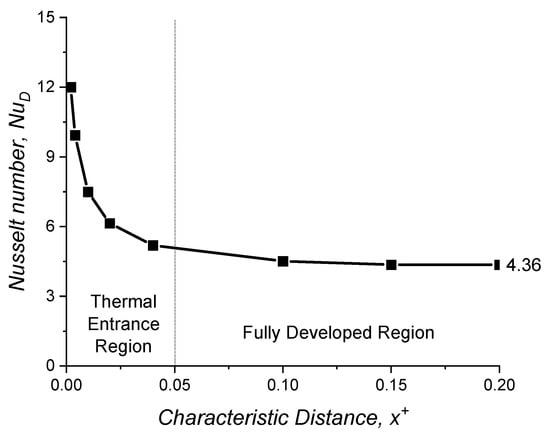 To obtain the heater surface temperature distribution in the EHC using Equation (9), should be known through the entire EHC region. The results of the Nusselt number () presented in literature are used to obtain the in the thermal entrance region and the fully developed region. Here, is a non-dimensional number denoting the ratio of convective to conductive heat transfer, defined as in Equation (17).