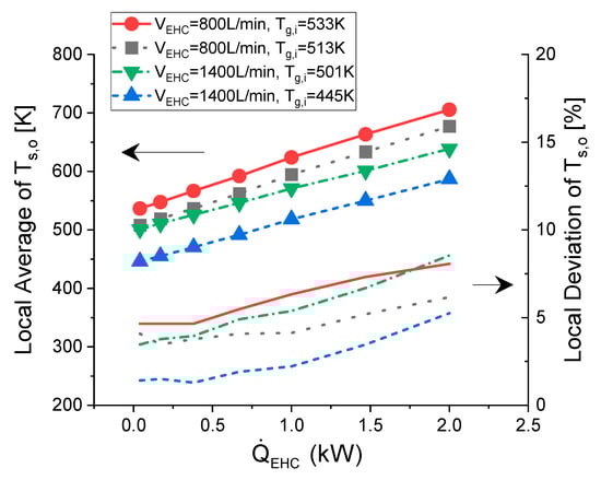 The local average and deviation results of measured using the IR camera are presented in Figure 6. The results show that the local deviation of is a maximum of 8.64% in the measurement conditions, which demonstrates the local uniformity of . This near-uniform surface temperature distribution can be from the uniform heat generation of the heater and the negligible stray heat transfer from the EHC to the surroundings. It implies that the current analysis scheme and model simplifications are adequate.