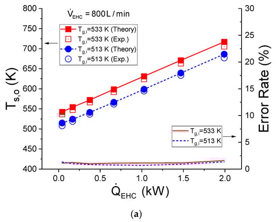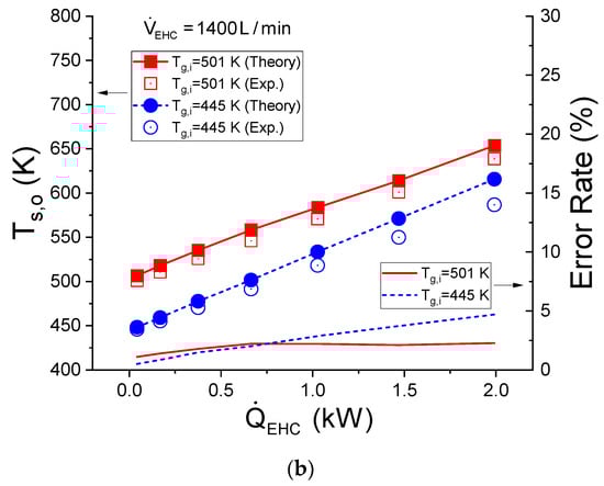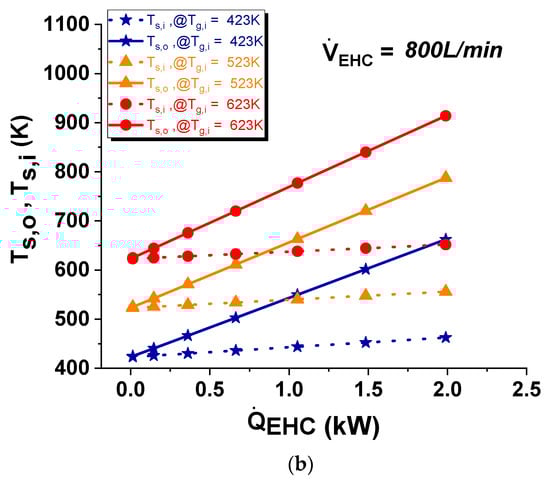 Comparison of predicted and measured surface temperature results at the EHC outlet () under various exhaust gas flow rates () and temperatures (), and supplied heater powers (): (a) = 800 L/min, (b) = 1400 L/min ( = 2.7 mm, = 20 mm).