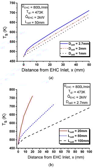 Figure 8b presents the effect of on the surface temperature distribution in the EHC. Only the results in a fixed condition of the other parameters ( = 800 L/min, = 473 K, = 2 kW, = 2.7 mm) are presented. The results show that the slope of decreases with the increase in because the , the only factor affecting the slope in Equation (9), is inversely proportional to , as shown in Equation (5). The decrease in the slope and causes the lower at longer in all regions of the EHC. Again, the effect of on is insignificant due to the substantially high in the inlet ().