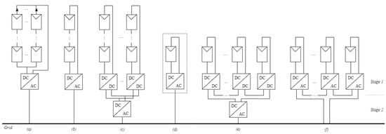 A second possibility of using cascade converters is presented in Figure 1f. In contrast with the previous ones, the DC-AC cascade inverter uses only one stage of power conversion. Each PV module is connected to a DC-AC converter whose output is in series with the output of the other converters. Such a configuration has the good feature of being similar to the AC module converter, bringing a better use per PV module due to the individual MPPT, however, with lower cost and greater efficiency [12].