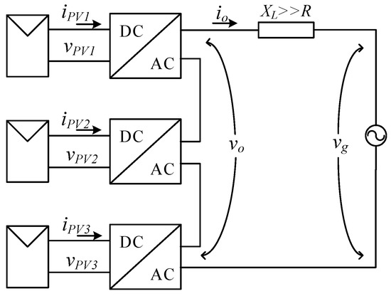 According to diagrams in Figure 5, the control system uses the reading of eight variables, being: PV arrays voltages (vPV1, vPV2 e vPV3), PV arrays currents (iPV1, iPV2 e iPV3), grid voltage (vg), and multilevel inverter output voltage (vo). In accordance with (5), the converter output current (iv) is calculated through a virtual impedance, where R and L correspond to the approximated values of the connection resistance and inductance, respectively.