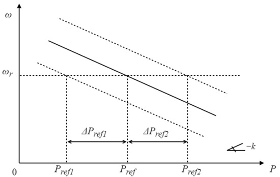 Assuming a generator set already connected to the power grid, from the change of the curve will be adjusted to change the transmitted power. In this way, a new equilibrium point will be reached since the system will balance in . According to Figure 3, dashed lines represent slope curves for situations whose reference power has changed.