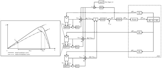 Figure 6 presents the complete view of the system. An important point to observe in this representation refers to the PV arrays voltages. These voltages depend on the solar irradiation, and they are also affected by the delivered power variation. Consequently, PV voltage variations strongly interfere in the inverter output voltage, which makes its regulation a challenging task. It is also important to mention that the part surrounded by the dashed lines concerns the droop-control and the physical plant operation . represent the powers delivered by each inverter bridge. Note that these powers are the result of the tracked power weighted by the modulation indexes , in this case represented by the RMS values of . Looking at Figure 5 and Figure 6, it is noteworthy that are obtained from the product between two signals, which means, they depend on both the MPP tracking and the modulating updating.