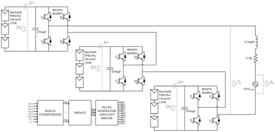 Figure 7 contains a general schematic and Table 2 summarizes the electric parameters for the circuits used for grid connection. As noted, each inverter bridge works from a PV array formed by three photovoltaic panels in series. For the experiments, a real plant was used, composed of Sun Earth® panels, model TBP156 × 156-60P, with rated power of 235 W. In the input of each inverter bridge, an electrolytic capacitor of 4700 µF was used to minimize the inductive effect of connection cables between panels and inverters. To compose the H-bridge, since it is a prototype whose controllers would need experimental adjustments, it was decided to use power switches with over-rated characteristics, ensuring robustness even in adverse operating conditions. The switch model adopted was the IRGP50B60PD1, with blocking voltage of 600 V and continuous operating current of 33 A. For connection to the mains, a 9.74 mH connection inductor with an intrinsic resistance of about 100 mΩ was used.