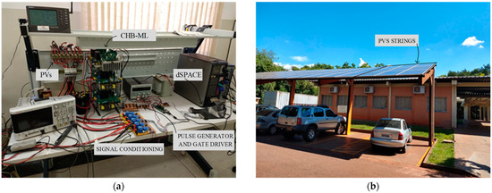 The control system consists essentially of the three blocks shown in Figure 7. At first, the sampled signals go through the conditioning hardware to adjust amplitudes and filter noise. The conditioned signals (sig1, ..., sig8) go to the control system embedded in the DSPACE® processor. As a result of the control actions, the modulating signals (m1, m2 and m3) go to an external hardware where they are compared to the triangular carriers to generate the switching pulses. Figure 8a,b show, respectively, the implemented prototype and the set of photovoltaic panels used during the experiments.