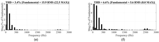 Figure 9a contains the waveforms for the CHB-ML output voltage (yellow), current (red) and power (magenta) injected into the electrical grid during irradiation of 1250 W/m2. Still for this situation, the inverter voltage and current harmonic spectra are shown in Figure 9c,e, respectively. Figure 9b contains the waveforms for the voltage (yellow), current (red) and power (magenta) during irradiation of 300 W/m2. The harmonic spectra for both the inverter voltage and output current are shown in Figure 9d,f, respectively. For all situations, THD was calculated considering harmonics up to 3 kHz. The electrical parameters for the situations of high and low irradiance are summarized in Table 3. It is interesting to observe the equilibrium reached by the indexes denoting the small differences in the power contribution of each PV array for both situations. Another point to be considered is the superiority of the indexes for high irradiation, confirming the more significant contribution of the PV arrays for this condition.