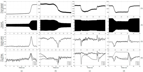 Figure 10 shows the behavior of the system under different situations of irradiation and PS. In the scenario presented in Figure 10a, graphic 1 represents the power transferred to the electrical grid. According to the voltage curves of the photovoltaic arrays, shown in graphic 4, the increase in irradiance raises the voltage in the PV sets. As a matter of consequence, there is an increase in the output voltage of the inverter (graphic 3), which determines the essential need for increasing power transfer. Therefore, the output voltage stabilizes as the new MPPT is reached. Both in graphic 1, referring to the power transferred to the power grid, and in graphic 2, referring to the current injected into the power grid, it is evident that the system stabilizes at a new point of operation after the increase in irradiance.
