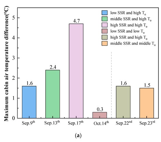 Because of the greenhouse effect, the stronger the solar radiation, the more heat is accumulated in the cabin, and the greater the difference between the ambient temperature and the air temperature inside the cabin. At this time, more heat is emitted through the window gaps because of the thermal pressure; thus, cracked open windows contribute to a larger decrease in the cabin temperature. The heat accumulation of the vehicle varies under different ambient conditions on the measurement day, as shown in Figure 9. The higher the value of SSR and To, the larger the temperature difference between the ambient air and the air in the cabin with closed windows; thus, the point deviation becomes more obvious. When the SSR and To are both low, the point deviation is almost not. Therefore, the higher the temperature and SSR, the better the cooling effect of open windows. The degree of point deviation indicates that it is beneficial to open windows under high To and SSR conditions. Under high To and low SSR conditions, windows may be left closed or open. However, it is unnecessary to open the windows when the SSR is low. Among all the measurement days, the ambient conditions on 17 September are most comparable to those of most summer days, and To and SSR are slightly lower than the maximum values in summer. Under the ambient conditions of this day, opening the window gaps can reduce the cabin temperature by 6.7 °C, which is considered to be representative of an effective cooling method. If the vehicle is exposed to more severe sun radiation, opening the window gaps can have a better temperature reduction effect.