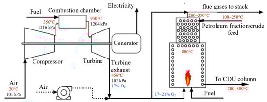 A principle description of a gas turbine integrated with the crude distillation unit is provided in Figure 1. Flue gases at a temperature above 450 °C are routed to the furnace for oxidation of the fuel. Such an arrangement allows the utilization of commercial gas-fired power plants without any major modifications to the furnace. From a safety viewpoint, there should be an additional fuel stream to the furnace in case of the unexpected shutdown of the gas-fired power plant. Preliminary calculations of the authors resulted in a requirement for the specific turbine power of 127 kWe per one MW of the furnace heat capacity when the efficiency is 80%.