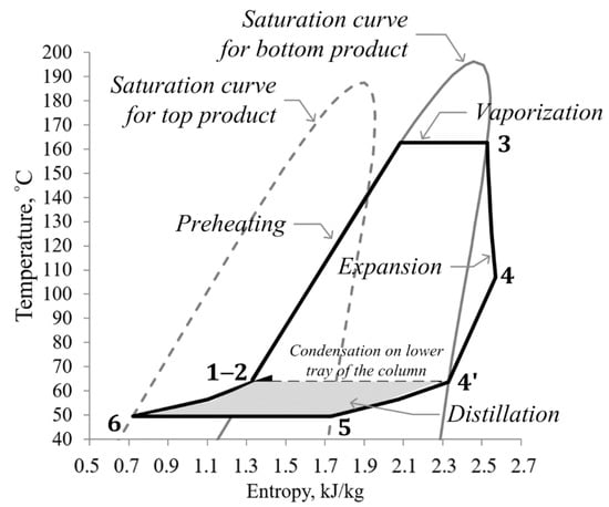 A principle similar to ORC cycle integration to the column bottom was patented in 1984 by Carson [6] allowing highly efficient utilization of incremental amounts of energy above what is required for the operation of a distillation column. Indeed, in distillation, the energy is consumed for vapor production at a pressure required for distillation. On the other hand, in the Rankine cycles, energy for the working fluid evaporation is required and condensation is wasted which is determined by the cycle thermodynamics. Only a smaller part of the energy generated goes into useful work which defines the cycle efficiency. Increasing the pressure in the reboiler and installing the expander downstream gives fundamentally new integrated distillation schemes that allow the separation of mixtures more efficiently from the thermodynamics viewpoint because the evaporation energy input for distillation is free of charge for the integrated process of electricity production. According to the knowledge of the authors, no publications concerning the practical implementation of the concept or the performance analysis are available in the open literature.