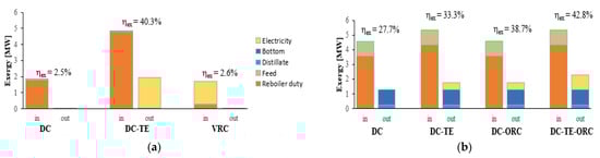 The exergy efficiency of DC-TE schemes can achieve the level of 33.3–40.3% which is relatively high for distillation processes and is close to the efficiency of the ORC integrated with DC.