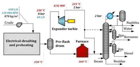 Turboexpanders can be integrated in another way to CDU as shown for an illustrative example in Figure 9 where a partially evaporated crude after the preheating train goes to the separator and the vapor phase proceeds to the turboexpander at an elevated pressure of 8 bar. The vapor stream comprising gases, dissolved in oil, and naphtha fractions, expands to the operating pressure of the main column. The turbine exhaust vapor may be directed to the heater or enters the column similar to a pre-flash CDU design. An estimated power generation for the large-capacity CDU of 5.5 billion tons per year can be at the level of 0.92 MW.