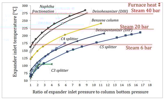 Most processes operate in the context of an existing site in which a number of processes are linked to the same utility system especially, as stated above, the steam pressure is limited to a set of low, middle, and high pressure. Therefore, often at real plant sites, there are distillation columns for which the heat utility temperature exceeds what is required for a reboiler by 50–100 °C. Figure 10 illustrates the temperature levels compared to the temperature rise in the reboiler for the integrated turboexpander. In the case of using steam of a certain quality, the pressure at the inlet of the expander and, as a result, the efficiency and the expander power will be limited by the temperature of the applied heat source. In this case, columns with a furnace are the most promising, being most often found in oil refineries.