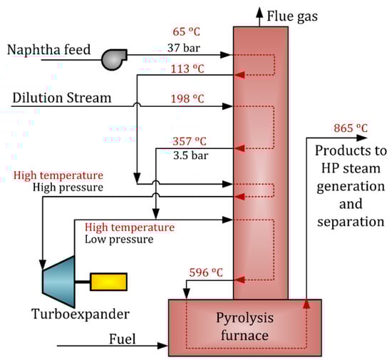 Another example of an efficient integrated reaction section design might be naphtha pyrolysis which is the main process of monomers production. Figure 12 shows a general concept of the turboexpander integration into a typical thermal cracking section of the olefin plant based on THE flowsheet described in [35]. A typical feature of this process is the high temperature of the reaction and a specific way of cooling the products, as the latter is not involved in the heat exchange with the feedstock but is rather utilized for high-pressure steam generation. The feedstock heating and evaporating in the steam presence is done by the flue gases in the convection chamber of the pyrolysis furnace. In the turboexpander integration design, by analogy with the previous scheme, the mixing of the feedstock with supplementary streams occurs after expansion from a high-pressure level of the feedstock in the turboexpander. The pressure of the turbine exhaust stream should be sufficient enough to pass the last heating section and the reaction radiant tubes.