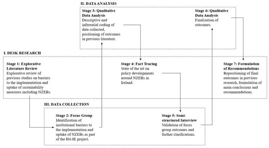 Whether empirical or theoretical, having reviewed the different ways professionals’ perceptions were included in previous research, this study engages in the discussion through several means. First, it prevents influencing professionals’ contribution by purposely not adopting the explicit concurrence approach. It aims at initially seeking out the raw perceptions and knowledge of professionals around current barriers thus contributing to the need for research to investigate barriers more closely and gaining insight into the reasons behind their recurrence. Second, this study establishes a balance between empiricism and theory by recognizing perceptions throughout its process, from inception through to implementation and analysis of outcomes. Third, it adopts an iterative approach that alternates between desk research, data collection, and data analysis. The research process follows the initial explorative literature review and focus group with fact tracing and semi-structured interviews for the validation and finalization of outcomes. This is what enables the distinction of professionals’ perceptions in its outcomes. This is of particular importance seeing as it is these implicit characteristics, namely perceptions, established habits, and embedded knowledge of professionals, that are the most difficult to identify and articulate and yet that could significantly disrupt the process of change []. Figure 1 depicts this iterative approach by illustrating how the study alternates between desk research, data collection, and data analysis through its different research stages along with a brief description of each stage. The following Section 5 describes in more detail the methods implemented throughout.
