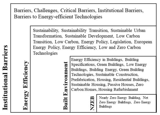 Overall, a wide range of documents were consulted in this study. In an initial stage, the desk research consisted of an explorative review of the literature to establish an understanding of the development of barriers to the implementation and uptake of NZEBs. For that, three main research concepts were used: institutional barriers, the built environment, and energy efficiency. The main keywords derived from these concepts and used in the search queries are as follows: challenges, obstacles, hindrances, together with building and/or housing and low-energy, low carbon, (near) zero-energy, zero-carbon. The main search engines consulted are Scopus, Google Scholar, and the Delft University of Technology search engine. The main sorting principle that determined whether or not an article was included in this study was the explicit address of barriers in its text. In other words, studies that did not explicitly address barriers in their text were discarded. This selection process resulted in 25 references ranging from academic journal articles and conference proceedings to textbooks. The outcomes of this initial explorative review are presented in Section 2.1, Table 1, where previous studies are listed according to their year of publication, study location, main keywords, research perspectives, and methods. Figure 2 depicts how the collection of keywords used in these 25 references falls within the research concepts of this study. At a later stage, the desk research revolved around establishing the state of the art on policy development around NZEB implementation in Ireland. To that end, different types of documents were consulted such as government publications, reports, and European projects’ websites. In total, 7 main documents were referred to. These include the Irish Climate Action Plan, the Irish National Energy and Climate Action Plan, its following quarterly progress reports, the European Commission Assessment Report, and a report published by Ireland’s Expert Group on Future Skills Needs.