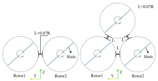 The aerodynamic performance of a single wind turbine was evaluated experimentally. The dimensions of the computational domain were 100 m × 36.6 m × 24.4 m, and the length of the wake flow area of the wind turbine was 80 m. The rotor center coordinates were (0, 0, 12.2 m), 20 m from the inlet, and the rotation plane was located at x = 0 m. Considering the influence of the wall surface on the calculation results for twin- and tri-rotor wind turbines, the length and width of the calculation domain were increased. The dimensions of the computational domain for the twin-rotor wind turbine were 80 m × 46.6 m × 24.4 m, as shown in Figure 1, while the dimensions of the computational domain for the tri-rotor wind turbine were 80 m × 46.6 m × 28.2 m. In order to calculate the wind turbine wake flow field accurately, the grid was refined in an area with width and height 24 m × 20 m and length ranging from −15 m to 55 m. In this study, we mainly consider the near-wake flow. Thus, the grid near the wind turbine was divided in a more detailed way. The computational domain consisted of hexahedral structured meshes. The wind rotors were placed in the same plane, with an outer contour distance of 0.07 R between rotors (a distance less than 0.1 R indicates that two rotors are very close under working conditions), and the rotation angle had no phase differences. The position relationships in the twin- and tri-rotor setups are shown in Figure 2.