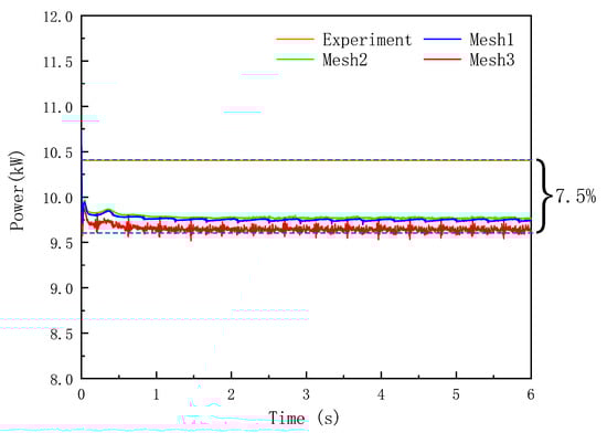 In order to verify the accuracy of the computational model, the aerodynamic performance of the phase VI wind turbine was first simulated. The calculation result is depicted in Figure 3, marked as a blue solid line for Mesh1. Three meshes were initialized, in order to validate the grid independence: Mesh3 with 900 million hexahedrons, Mesh2 with 1900 million hexahedrons, and Mesh1 with 2500 million hexahedrons. The average power with Mesh1 was 9.75 kW, within 6.3% of the experimental value of 10.4 kW. Therefore, the computational model was confirmed to satisfy the accuracy requirements. With this validated computational model, the aerodynamic performance of the phase VI wind turbine was simulated in the twin-rotor wind turbine calculation domain. The calculation results are presented in Figure 3, marked as green and red solid lines for Mesh2 and Mesh3, respectively. The average power with Mesh1, Mesh2, and Mesh3 was 9.75, 9.77, and 9.64 kW, respectively, all of which were within 7.5% of the experimental values. This comparison indicates that an increase in the computational domain width with the twin-rotor wind turbine had a small impact on the simulation results while still meeting the computational requirements.