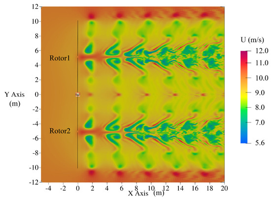 Figure 4 shows the velocity contour in the x–y plane of the near-wake of the twin-rotor wind turbine at z = 12.2 m (the wake is about 4 R). In the figure, a significant velocity loss can be observed after the wind flow passes the wind turbine, which gradually recovers as it moves away from the rotor. Due to part of the blades absorbing the largest aerodynamic energy, the largest velocity loss in the wake area is located in the rotor plane. The high-speed zone in the center part of the rotor results from negligence of the nacelle during the simulation; moreover, the compression of the fluid by the blade root and the sudden reduction in area also contributed to an increase in wind speed. On the upper and lower sides, due to the tip vortex, regular high speed zones also appeared.