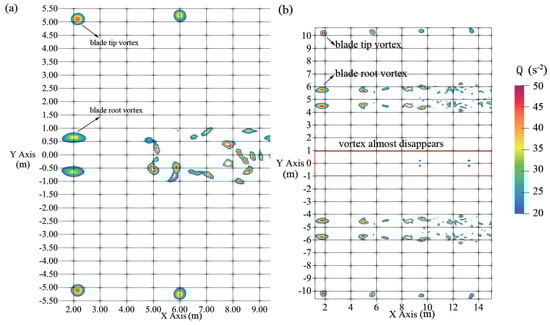 To improve the visibility of the blade tip vortices, the flow field was analyzed using the Q criterion. Figure 5 shows the vortex contour at z = 12.2 m with Q taking values ranging from 20 to 50. In the figure, the vortex core structure can be clearly observed. The vortex quantity in the rotor plane was the largest, mainly concentrated near the tip and root of the blade. During the progression of the blade tip vortex and root vortex after shedding from the blade, the intensity of vortex quantity at the center of the vortex nucleus became smaller, while the vortex nucleus gradually became larger. The reason for this vortex propagation is that fluid viscosity causes the fluid around the concentrated vortex to be involved into it, resulting in spreading of the concentrated vortex and an increase in the vortex radius. As the wake continued to progress downstream, the large-scale vortices broke up to form small-scale vortices. Comparing the results for the single-rotor wind turbine with those of the twin-rotor wind turbine, it can be seen that the single-rotor wind turbine led to obvious vortex generation at the tip of the blade, while the vortex in the middle part (near y = 0) of the twin-rotor wind turbine was significantly decreased.