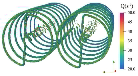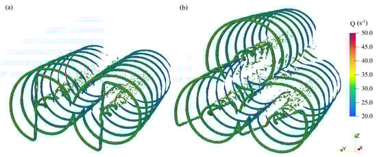 In order to show the development of the blade tip vortex in the wake flow more clearly, the 3D flow field was rendered. The wake vortex is shown in Figure 6, where the blade tip vortex and the blade root vortex with spiral-type structure can be clearly observed. In the figure, the blade tip vortex at Q = 20 to Q = 50 in the middle part of the twin-rotor wind turbine can be seen to almost disappear. A similar result can be seen with the tri-rotor wind turbine flow field.