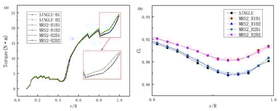 To clarify the source of this torque increase, torque values of the twin-rotor wind turbines at azimuth, along the blade spread and at each discrete point, were extracted, as exhibited in Figure 8a). In the figure, the torque can be seen to be enhanced at r/R = 0.8∼1, which is 0.2 R closer to the blade tip. The lift coefficients for the blade tip in this range are presented in Figure 8b). The coefficients of MRS2_R1B1 and MRS2_R2B2 had larger values than those of MRS2_R1B2 and MRS2_R2B1. This enhancement in aerodynamic performance near the tip at 0.2 R, combined with the near-wake analysis in Section 3.1, was reasonably attributed to the interaction of the blade tip vortices.