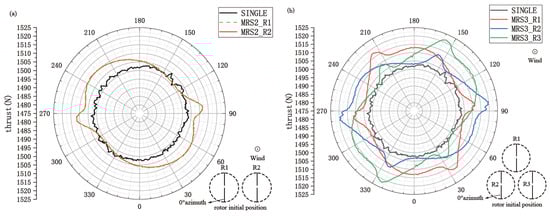 Thrust–Azimuth angle: (a) Twin-rotor; and (b) tri-rotor wind turbine.