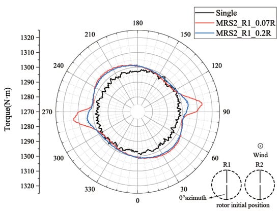 The torque variation patterns for the single-, twin-, and tri-rotor wind turbines with the rotor rotating over one week are shown in Figure 7. In the figure, Single represents single-rotor wind turbine, MRS2 represents the twin-rotor wind turbine, and R1∼R3 represents Rotor1∼Rotor3. Compared with the single-rotor wind turbine, the torque of the twin-rotor wind turbine had two peaks near and azimuth, with the maximum torque being enlarged by about 1.2%. Additionally, MRS3 had two more fluctuations in one rotation cycle of the individual wind turbine for the one extra rotor. In these conditions, the torque extremes occurred at the points where the rotating blades of the two wind turbines were close. Compared to the single-rotor wind turbine, the torque of the tri-rotor wind turbine was increased by 1.1% to 2.0%. Similar to MRS2, a slight increase in torque can be observed during each rotation cycle.