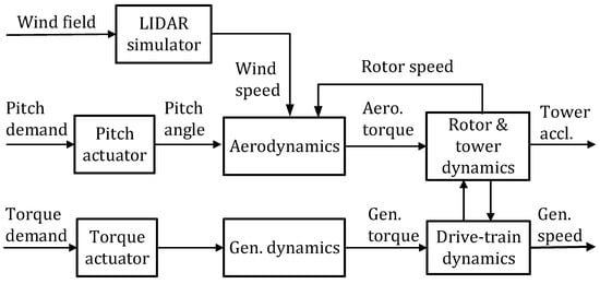 Conventional wind turbine control systems often use a feedback control scheme, in which proportional–integral (PI) or proportional–integral–derivative (PID) controllers are designed in response to sensor signals such as the generator speed and/or the tower head acceleration [,,,]. The PI and PID control designs can achieve a satisfactory energy capture performance. In addition, load reduction strategies have been developed, including the damping of resonances on the drivetrain and tower, which results in load reduction at specific frequencies [,,], and the alleviation of rotor asymmetrical loads through individual pitch control (IPC) or individual blade control (IBC) [,,]. There is an inherent delay problem with feedback control designs, that is, the controller can only respond to changes measured and transmitted via feedback. This means the controller can only make responses after the turbine has been affected by the turbulent wind. New methods need to be developed to reduce the impact of such delays in standard feedback control.