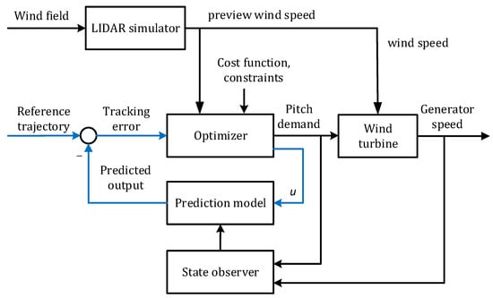 MPC has been used in wind turbine control for a range of operational and economical objectives, leading to the scheduled MPC for full operation modes [], economic MPC strategies [,], and the MPC with aero-elastically tailored blades []. LIDAR-based wind turbine MPC designs were also presented in various studies with the use of linear and non-linear methods. In [], an MPC design with a particular focus on rotor speed constraints was proposed, assisted by LIDAR-measured wind speed information. In [], a LIDAR-based MPC for wind turbine was developed, where the computational cost of the controller was taken into consideration to assess the control performance. A non-linear MPC design using LIDAR was proposed in [], in which the generator torque and the blade pitch angle were controlled simultaneously.