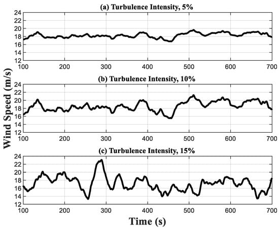 Three wind speed sequences were generated by the LIDAR simulator with the assumption of perfect preview. All had a mean value of 18 m/s. The first wind speed had a turbulence intensity of 5%, following the IEC standard 61400, which represents a typical above-rated environment in which the wind speed variations are relatively small, and hence the turbine operating conditions are around the operating point obtained at the mean wind speed. The second wind speed series was generated with a turbulence intensity of 10% to assess the control performance under a larger turbulence intensity. The third wind speed sequence had a turbulence intensity of 15%, because of which the wind speed varied between 13 and 23 m/s. A simulation with such a large turbulence intensity can be used to examine the MPC performance covering almost the full above-rated operational region. The three wind speed time profiles are shown in Figure 3.