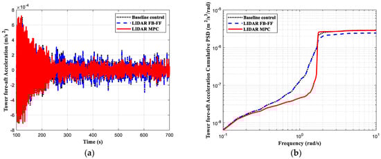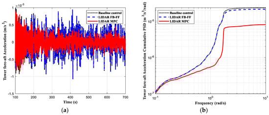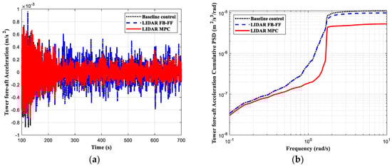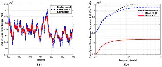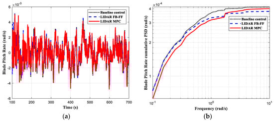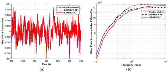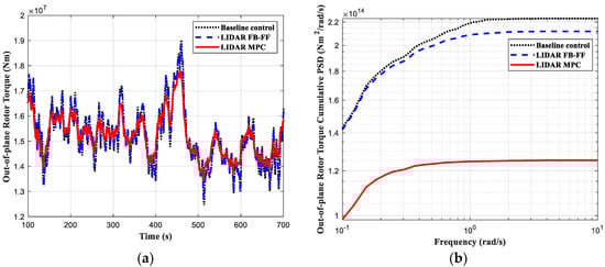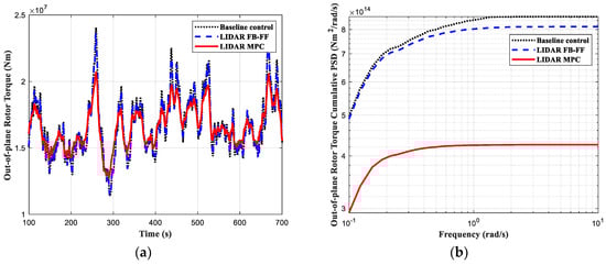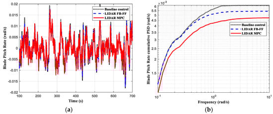 The simulation results are depicted in Figure 4, Figure 5, Figure 6 and Figure 7, where the load control performance and the pitch activities are presented in both time domain and frequency domain. In all the comparisons including the three controllers, the black dotted line indicates the baseline control, the blue dashed line the LIDAR FB-FF control, and the red solid line the LIDAR MPC. The standard deviation (std) of each time series and its percentage change with respect to the baseline control std are listed in Table 3.
