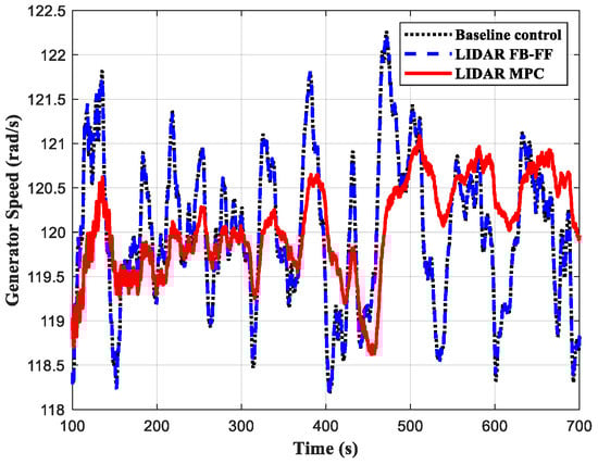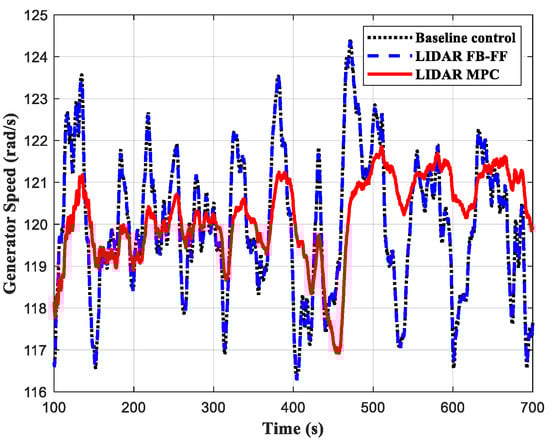 Compared with the baseline control and the LIDAR FB-FF control, under the three wind conditions, the LIDAR MPC design achieved a better performance in most cases with regard to rotor load reduction, generator speed regulation and tower load reduction. The improvement in the generator speed control was clear in all cases. This is probably because the term of generator speed regulation is directly included in the objective function of the MPC.