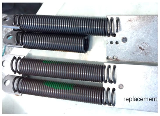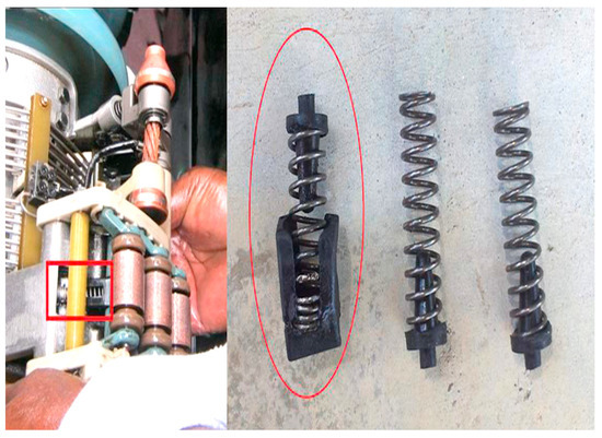 The following mechanical fault is contact failure. The root cause of this is wear and electrical corrosion of moving and fixed contact terminals. As shown in Figure 4, the contact terminal springs experienced fatigue failure after numerous operating cycles. Figure 5 shows a clear example of a broken energy accumulator spring. The energy accumulator springs, charge, and energizes the Geneva gear, which operates the tap changer at a very fast speed, usually around 50–60 milliseconds. As a result, this causes arcing on the contact terminals and an abnormal sequence of OLTC contacts.