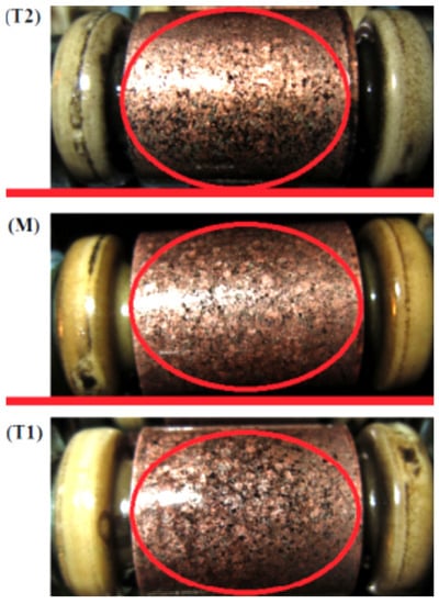 Erosion marks at the OLTC’s main transition contact (M) and two other transition contacts (T1 and T2) for the red phase [19].