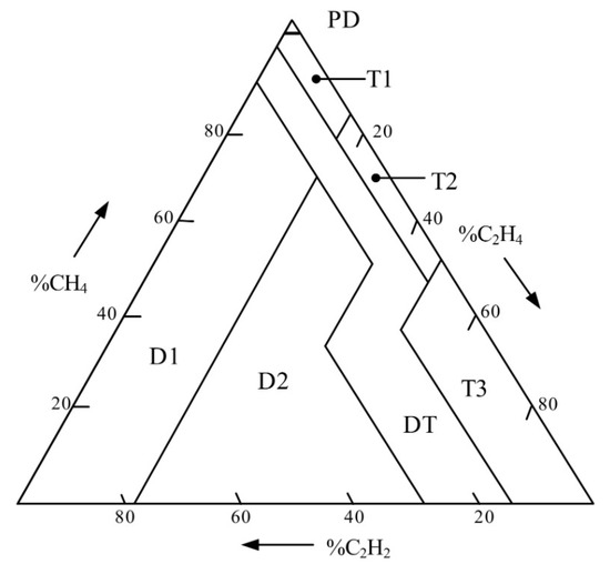 The Duval triangle method (DTM) has been proven to be the best method for fault identification in the transformer insulation. This can be justified, as several studies were conducted and found that among all the methods that are mentioned in Table 4, DTM has the highest accuracy when compared with the actual fault [11,22,23,41]. Figure 11 shows an example of a Duval Triangle used to assess the OLTC.