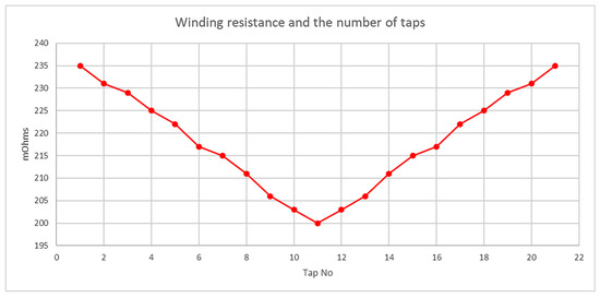 To perform a static winding resistance measurement (SWRM), the OLTC has to be in an idle condition [44]. With this method, it is possible to identify whether the contact surface of the OLTC’s switches is coked or other condition changes exist on the contact surface. A normal OLTC should be in a linear relationship when plotting the winding resistance and the number of taps, as shown in Figure 12 [45,46]. The higher the number of taps, the lower the resistance is. The downside of this method is that it does not measure the switching process of the diverter switch. This issue can be resolved by performing a dynamic resistance measurement [6].