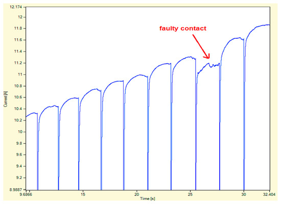 DRM can be executed when the OLTC switches are moving. As it can evaluate either transitional or stationery resistance when a tap’s position is moving, any relevant resistances of the switches can be measured as well as the transition impedances [48,49,50]. The tap changer operation can be identified based on sudden current changes called ripples. Typically, the ripples formed should be consistent and clean straight lines without bouncing marks [48]. This method can also be used for the tap selector contact, transition switch, diverter switch contact, and the main switch. Based on a case study [51], the researcher suspected a faulty selector contact after performing a DRM analysis, as shown in Figure 13.