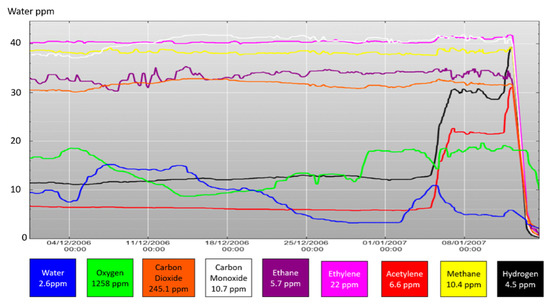 The concentrations and composition of hydrogen (), carbon monoxide (CO), carbon dioxide (), methane (), acetylene (), ethylene (), ethane (), oxygen (), and water () can be used to determine the type of fault and its severity, as shown in Table 2. Diagnostic procedures that detect many gases and account for the whole gassing picture are more accurate since all types of oil faults produce a range of gases rather than just one. From Table 2, the generation of hydrogen () is everywhere related to thermal, and this gas increases over time. The significant presence of acetylene () is generated when the thermal faults reach more than 700 °C.
