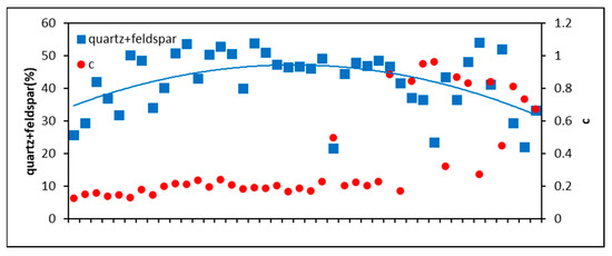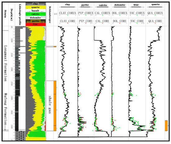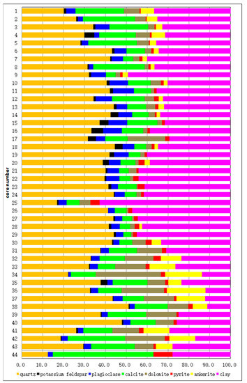 According to the logging curve and lithologic profile results, coring is carried out in shale gas producing horizon, and the coring depth is between 2382.43 and 2513.45 m. A total of 44 cores were taken. Quantitative analysis of mineral components was completed by X-ray diffraction analysis. The core number was from 1 to 44, and the depth gradually increased. The thickness of the formation was about 131.0 m. The types and contents of minerals are shown in Figure 3.